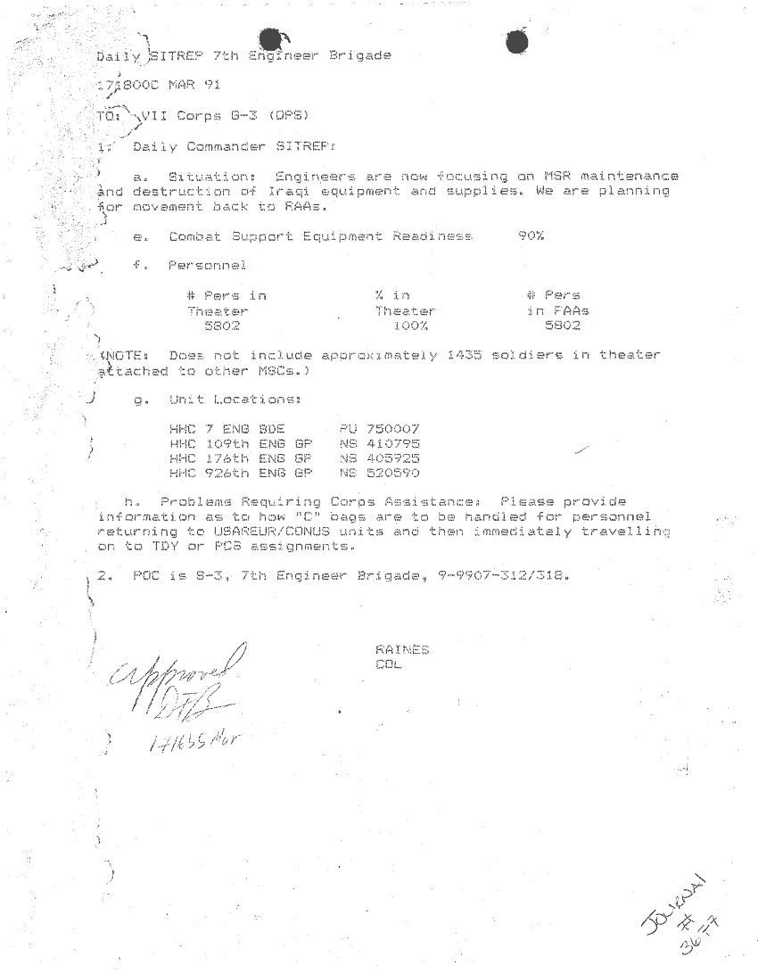 Document 87 f:/Week-24/BX000213/SITUATION REPORTS 7TH ENG BDE 22 DEC 90- 10 APR 91/daily commander sitrep:10259613090426