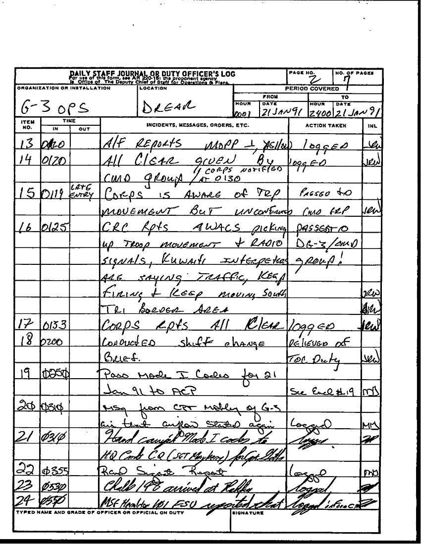 Folder Title = DUTY LOG G3 REAR 21 JAN 91