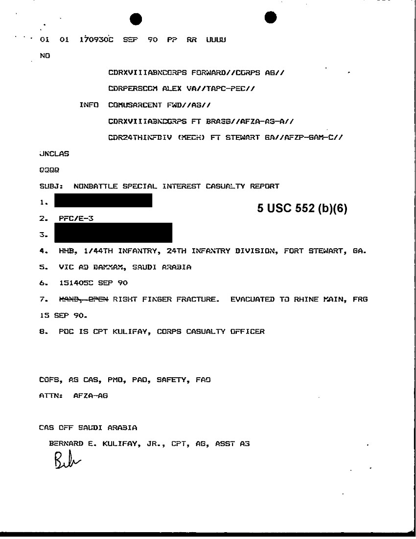 Document 10 f:/Week-15/BX000052/DUTY LOG G3 16-31 SEP 90/nonbattle special interest casualty report:1108961514028