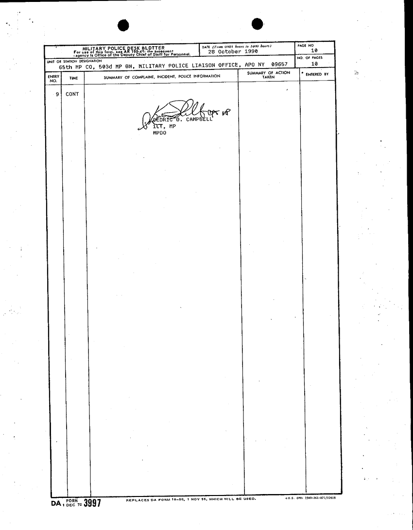 Document 12 f:/Week-18/BX000061/DA FORM 3997 MILITARY POLICE DESK BLOTTER-SEP-NOV 90/military police desk blotter 28 oct 90:11089615150340