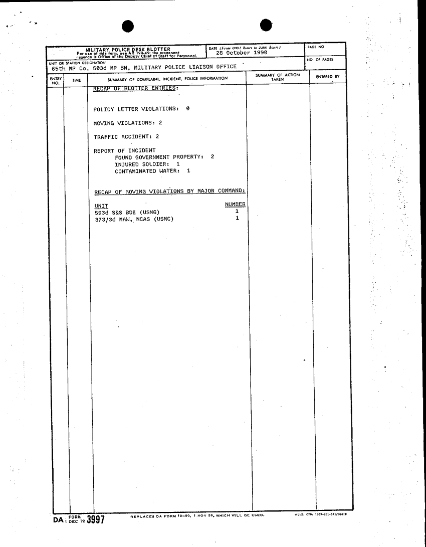 Document 12 f:/Week-18/BX000061/DA FORM 3997 MILITARY POLICE DESK BLOTTER-SEP-NOV 90/military police desk blotter 28 oct 90:11089615150340