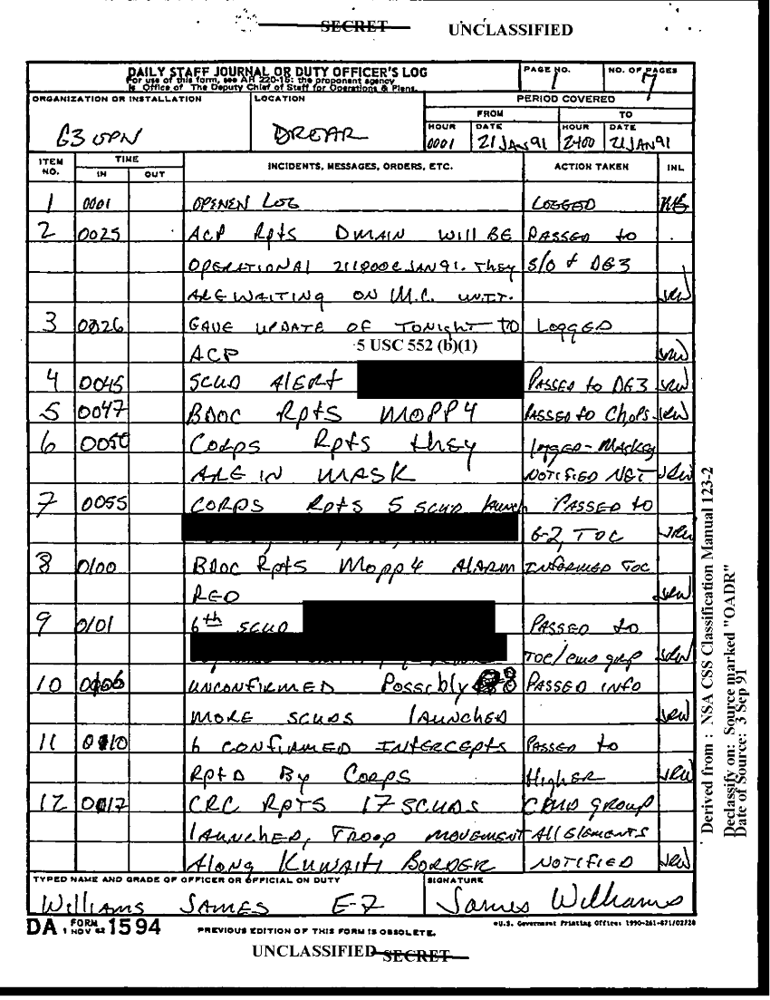 Document 7 f:/Week-22/BX001605/101ST ABN DIV AASLT DUTY LOG JAN 91-D/daily staff journal 21 jan 91:11089615141516