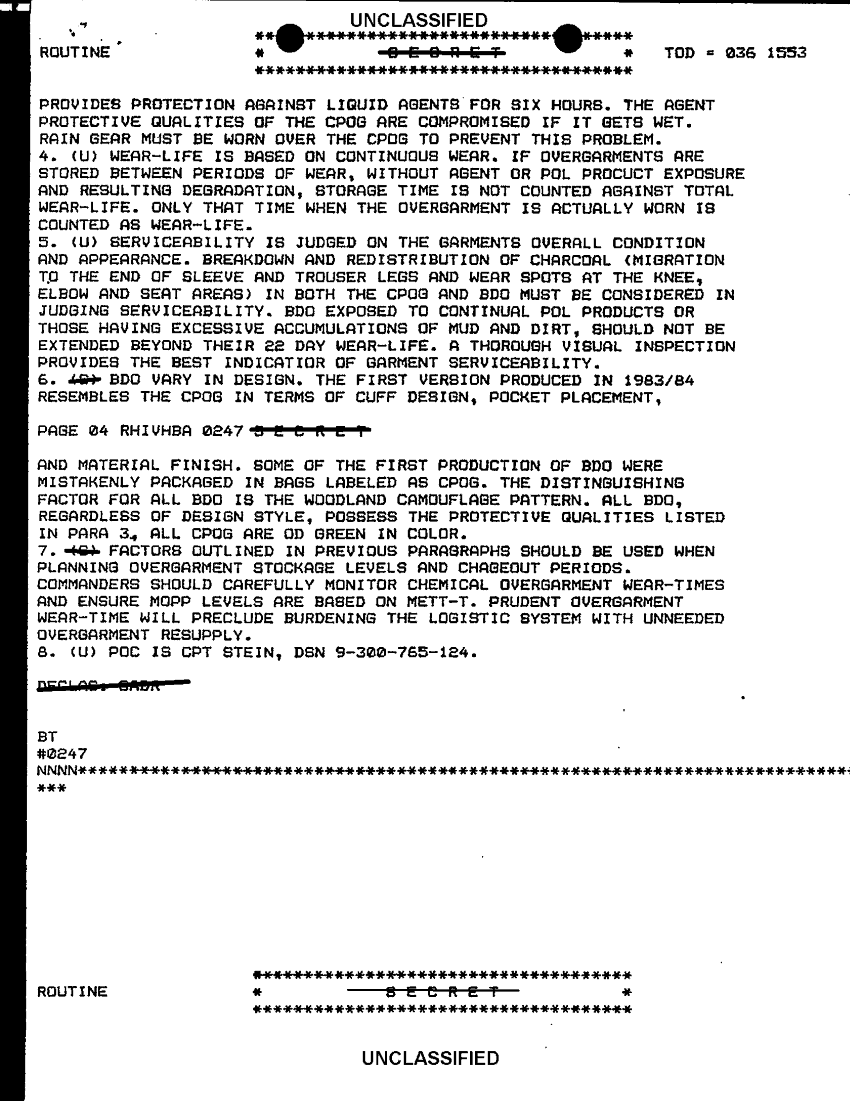 Document 2 f:/Week-29/BX000420/HISTORIANS BACKGROUND MATERIAL FILES - G3 NBC MIS 4 OF 4/chem overgarment wear life and serviceability up:12069615464248