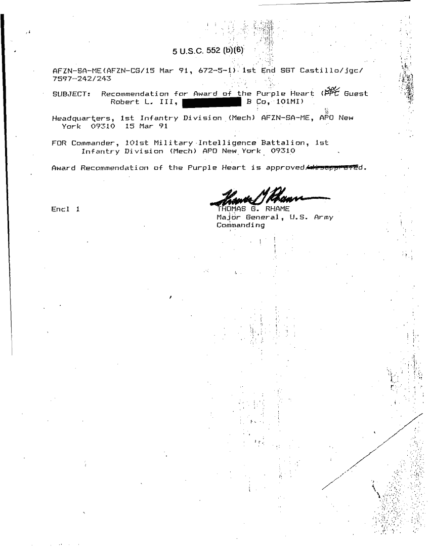Document 78 f:/Week-26/BX001004/AWARD GUEST ROBERT L III-1/casualty report award of the purple heart:12179611151925