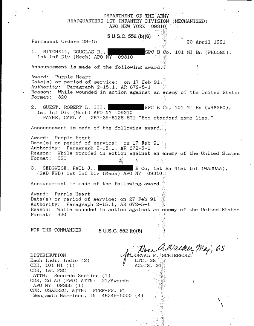 Document 78 f:/Week-26/BX001004/AWARD GUEST ROBERT L III-1/casualty report award of the purple heart:12179611151925