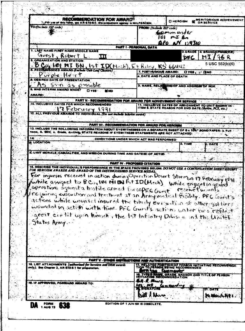 Document 78 f:/Week-26/BX001004/AWARD GUEST ROBERT L III-1/casualty report award of the purple heart:12179611151925