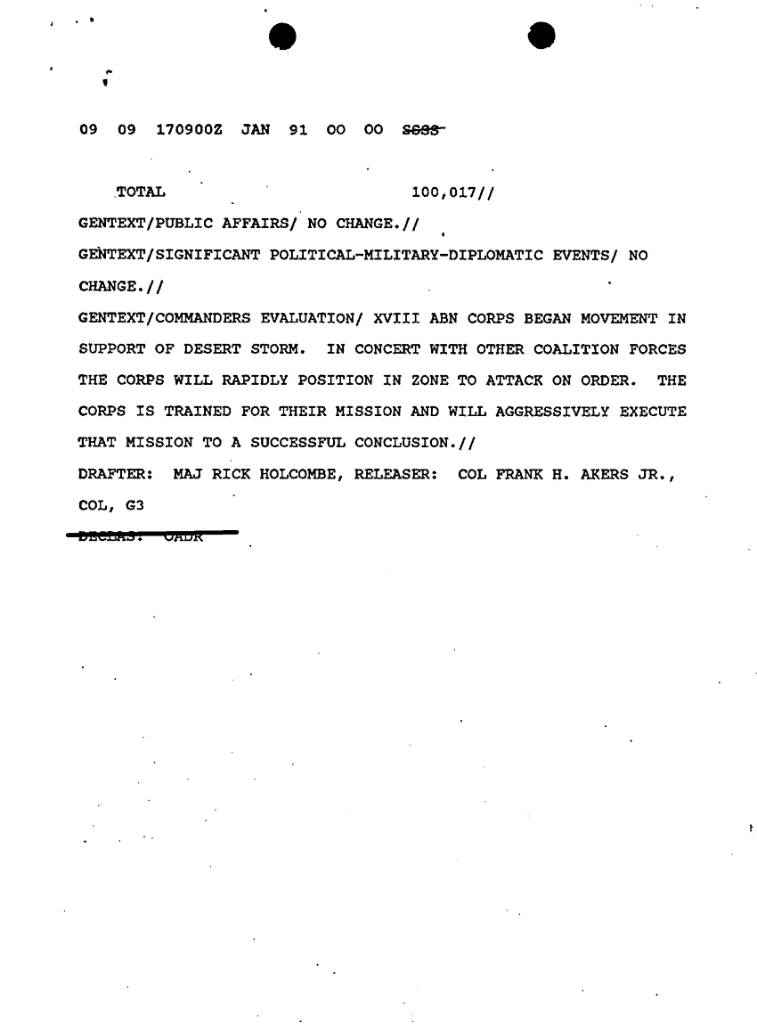 Document 9 f:/Week-10/BX000020/DUTY LOG G3 REAR XVIII ABC MAIN SITREPS CONT JAN 91/sitrep 17 jan 91:12179611154351