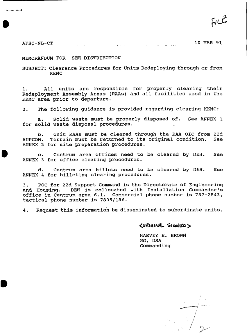 Document 9 f:/Week-09/BX000019/DUTY LOG G3 REAR 22 MAR 91/clearing procedures for units redeploying from k:12179611154856