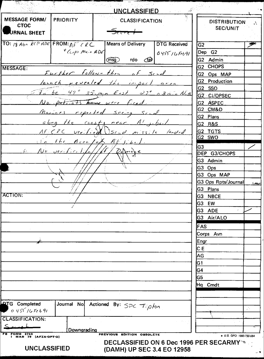 Document 1 f:/Week-09/BX000019/DUTY LOG G3 REAR 16 FEB 91/message form 0455 16 feb 91:12179611161687