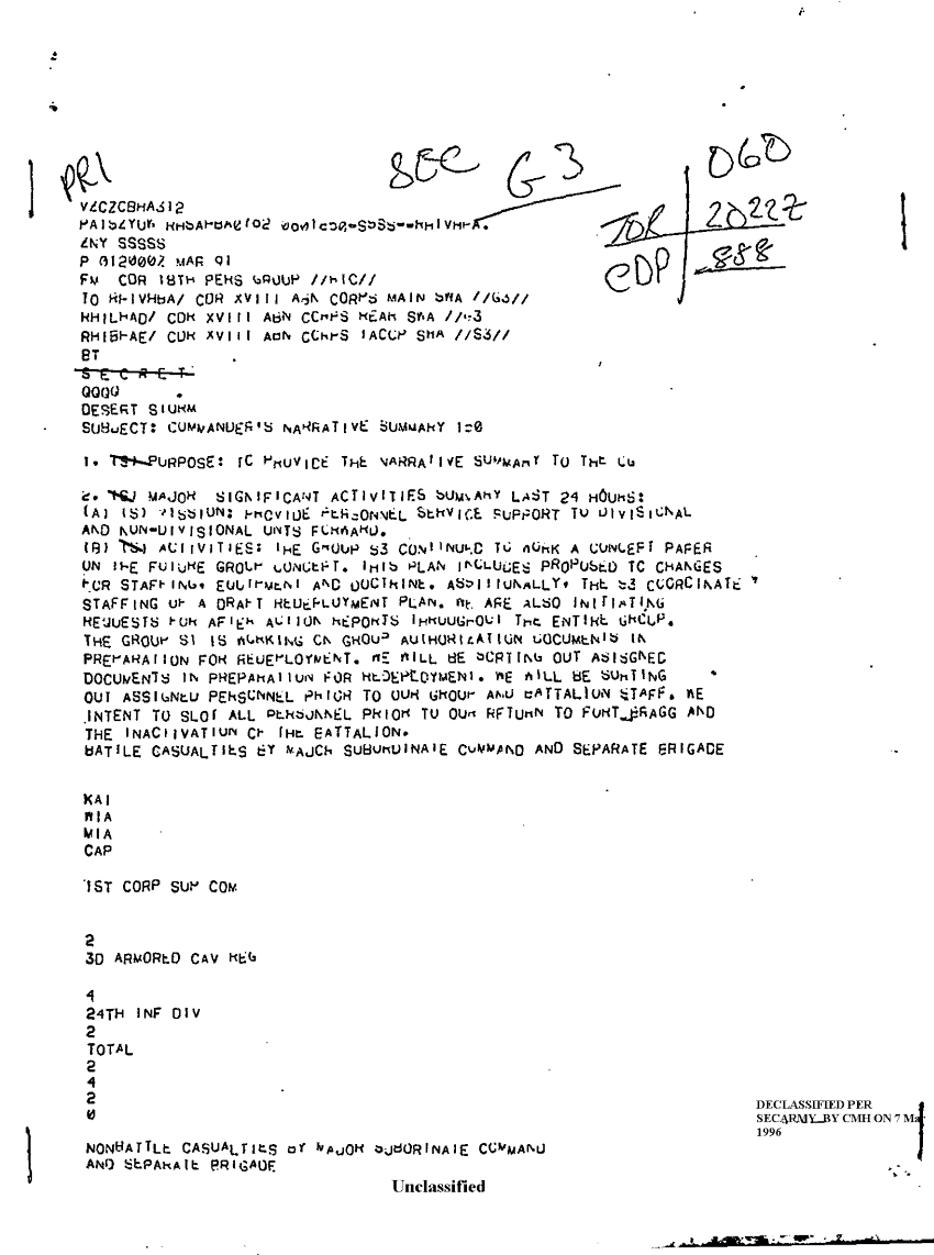 Document 10 f:/Week-08/BX000015/DUTY LOG 18 PER GP SITREPS G3 MAR 91/commander's narraive summary:12269616083520
