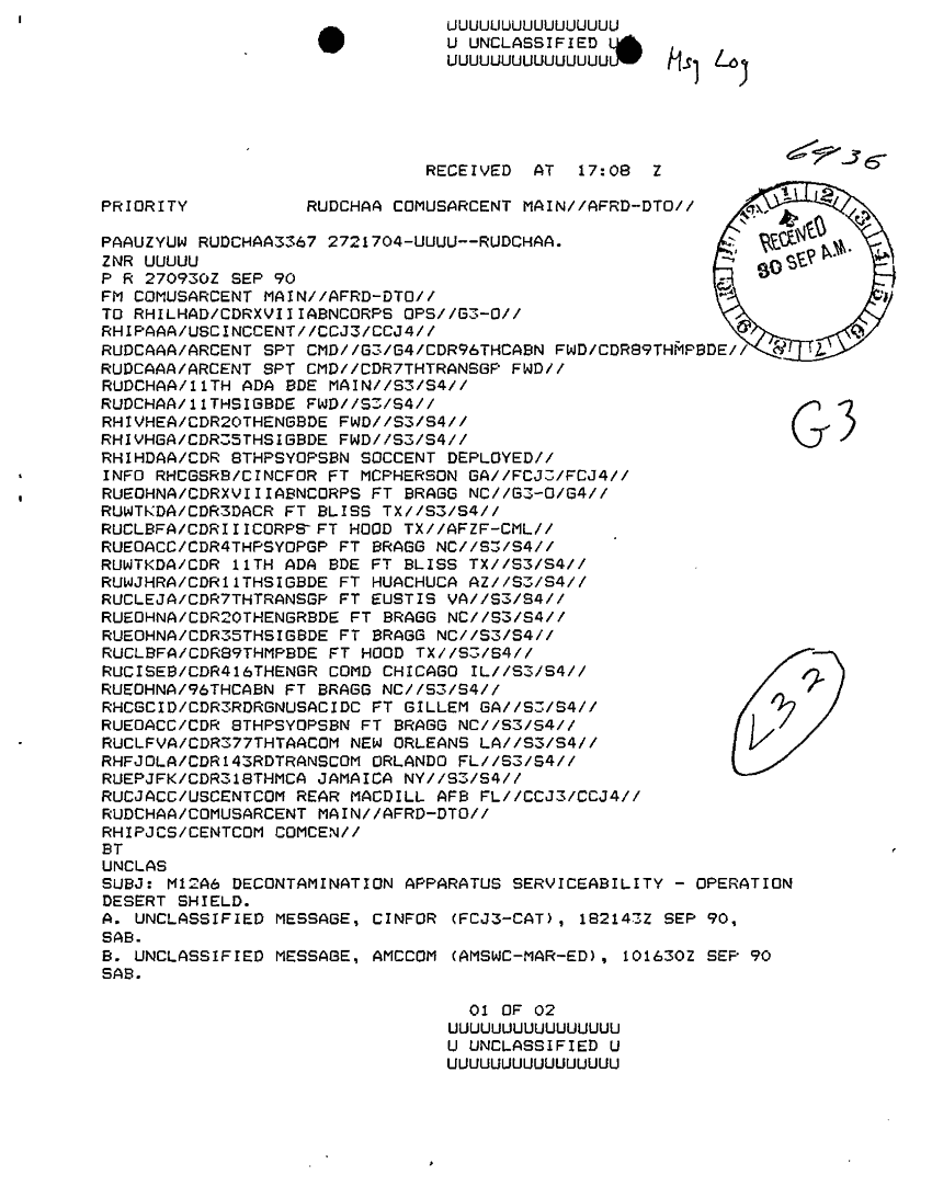 Document 2 f:/Week-29/BX000401/TACTICAL OPERATIONS CENTER LOGS - MSG FILE LOGS 30 SEP 90/m12a6 decontamination apparatus serviceability o:12269616083214