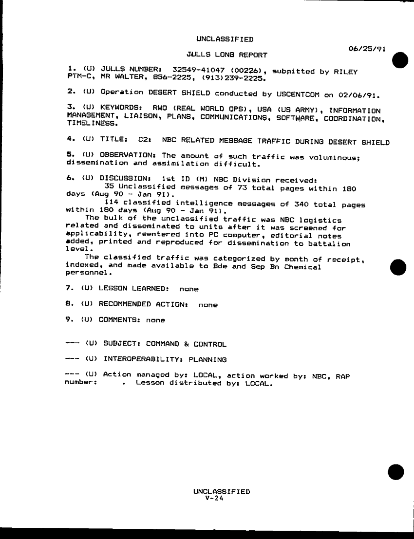 Subject = DESERT SHIELD STORM AFTER ACTION REPORT PHASE 1