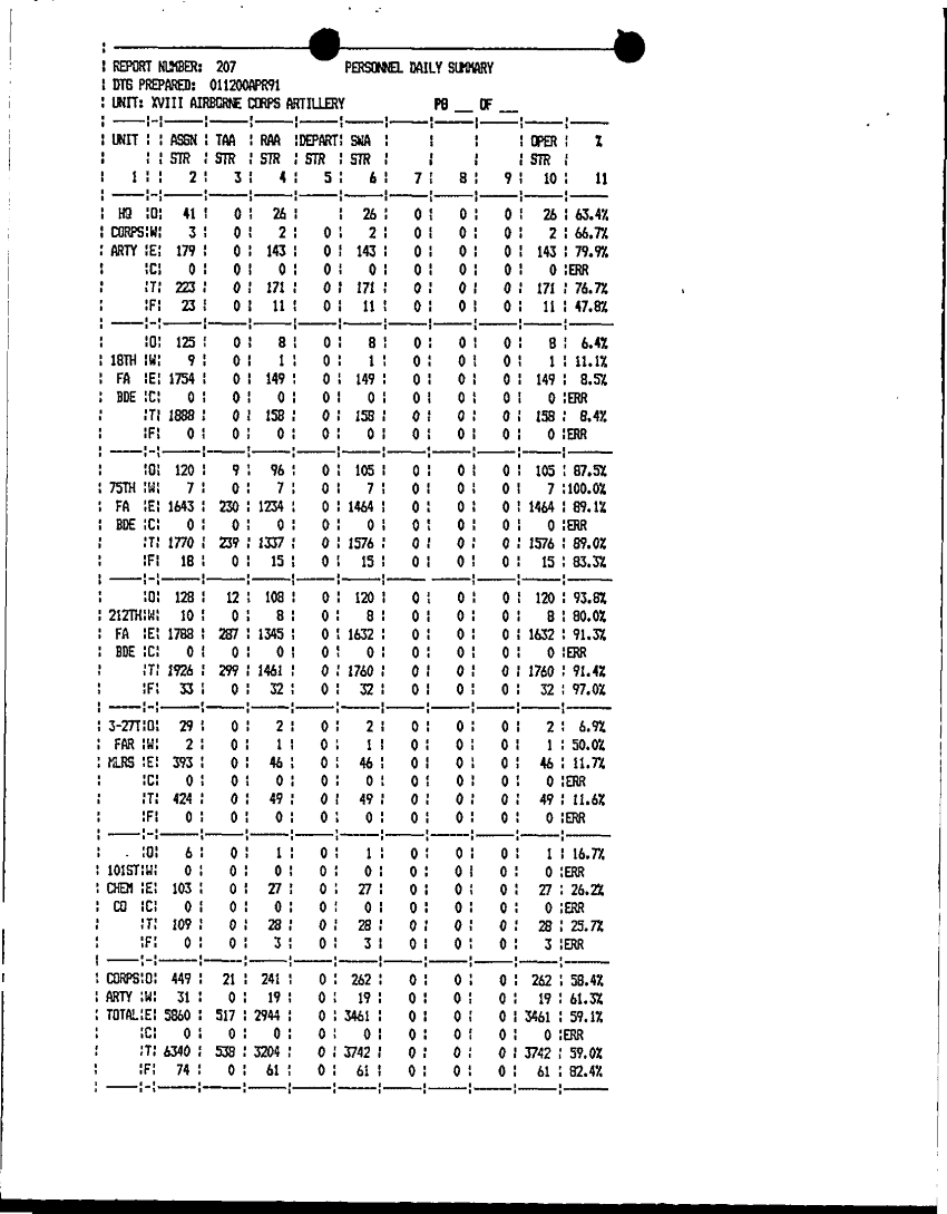 Document 1 f:/Week-12/BX000004/PERSONNEL STATUS REPORTS 28 MAR-2 APRIL 91/personnel daily summary report 207 01 apr 91:1226961608286