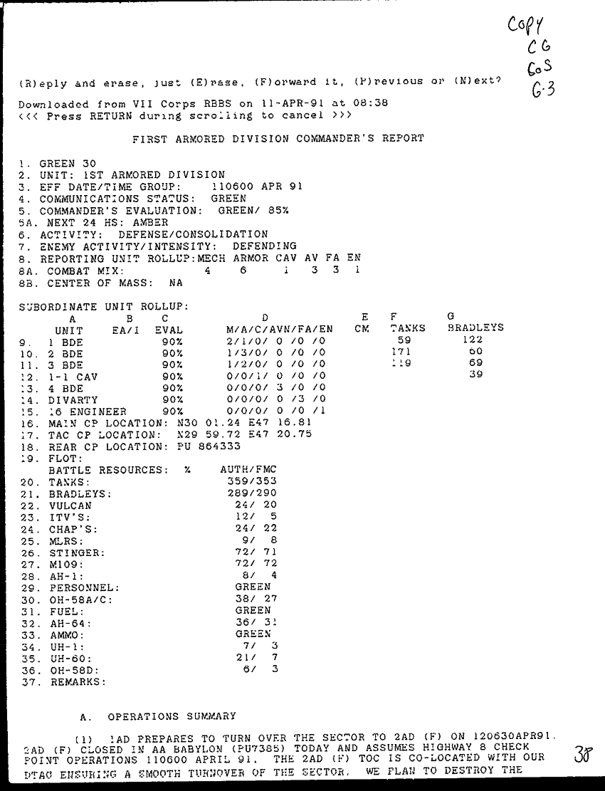 Document 4 f:/Week-48/BX000531/LOG AND REPORT 10-11 APR 91/first armored division commanders report 11 apr 91:0128971851483
