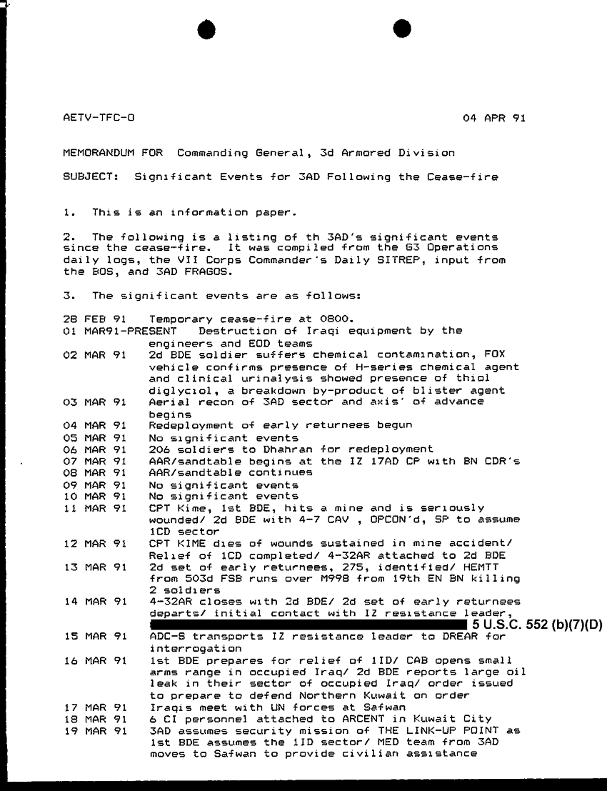 Document 3 f:/Week-48/BX000531/LOD AND REPORT 4-5 APR 91/significant events for 3ad following the cease fire:01289718515611