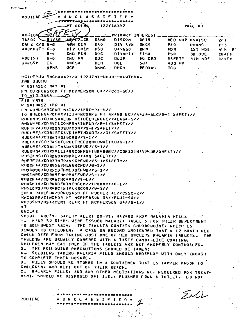 Subject = ARCENT SAFETY ALERT 20 91 HAZARD FROM MALARIA PILLS 8 MAY 91