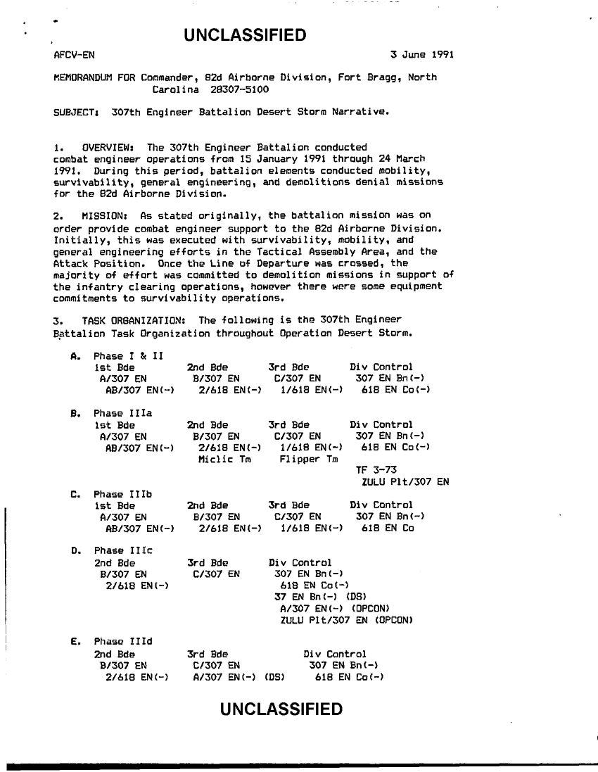 Subject = 307TH ENGINEER BATTALION DESERT STORM NARRATIVE 3 JUN 91