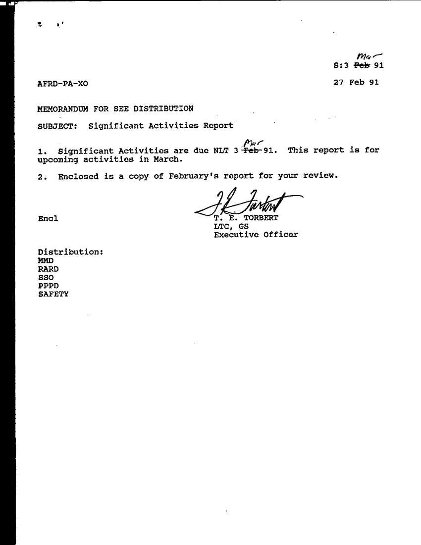 Subject = SIGNIFICANT ACTIVITES REPORT 27 FEB 91