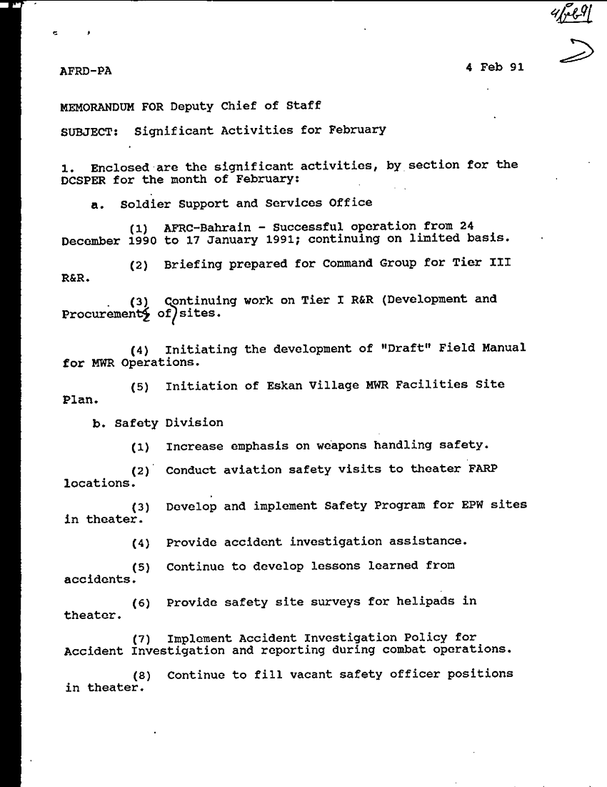 Subject = SIGNIFICANT ACTIVITES REPORT 27 FEB 91