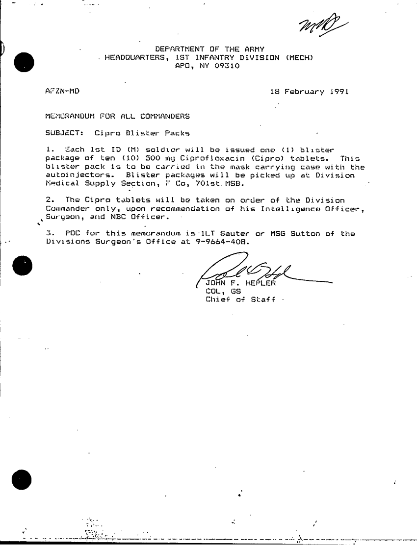 Document 1 f:/Week-34/BX001090/UP OF USCENTCOM GENERAL ORDER 1 AND AR 608-4/cipro blister packs:09229712012917