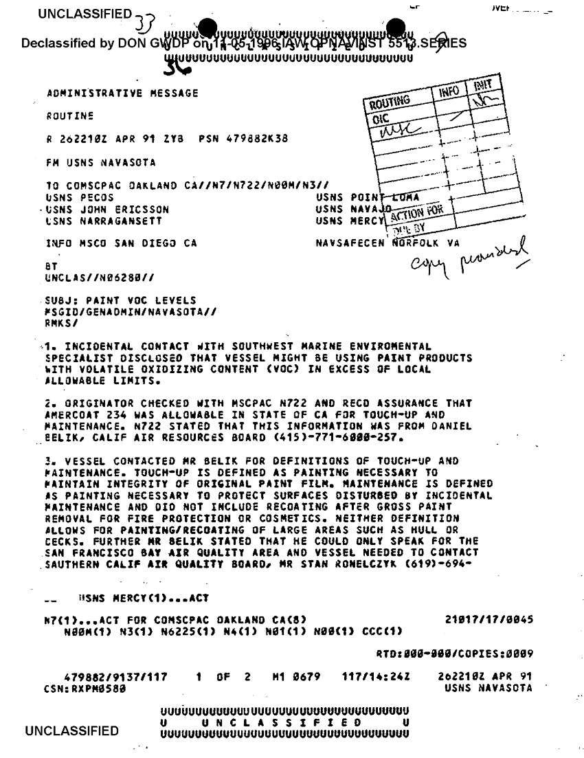 Document 2 f:/Week-39/BX303808/VARIOUS NAVAL MESSAGES FOLDER 4 APRIL 1991/paint voc levels 26 apr 91:11129610101210