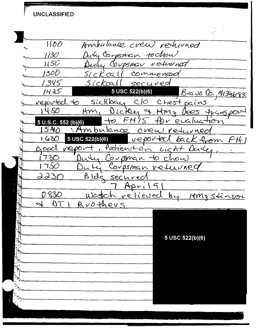 Document 49 f:/Week-37/BX303811/VARIOUS NAVAL MESSAGES FOLDER 4/various journal entries sick call 22 mar 91:0324971041562