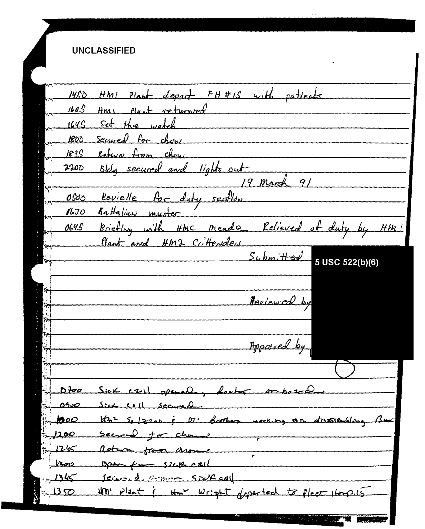 Document 49 f:/Week-37/BX303811/VARIOUS NAVAL MESSAGES FOLDER 4/various journal entries sick call 22 mar 91:0324971041562