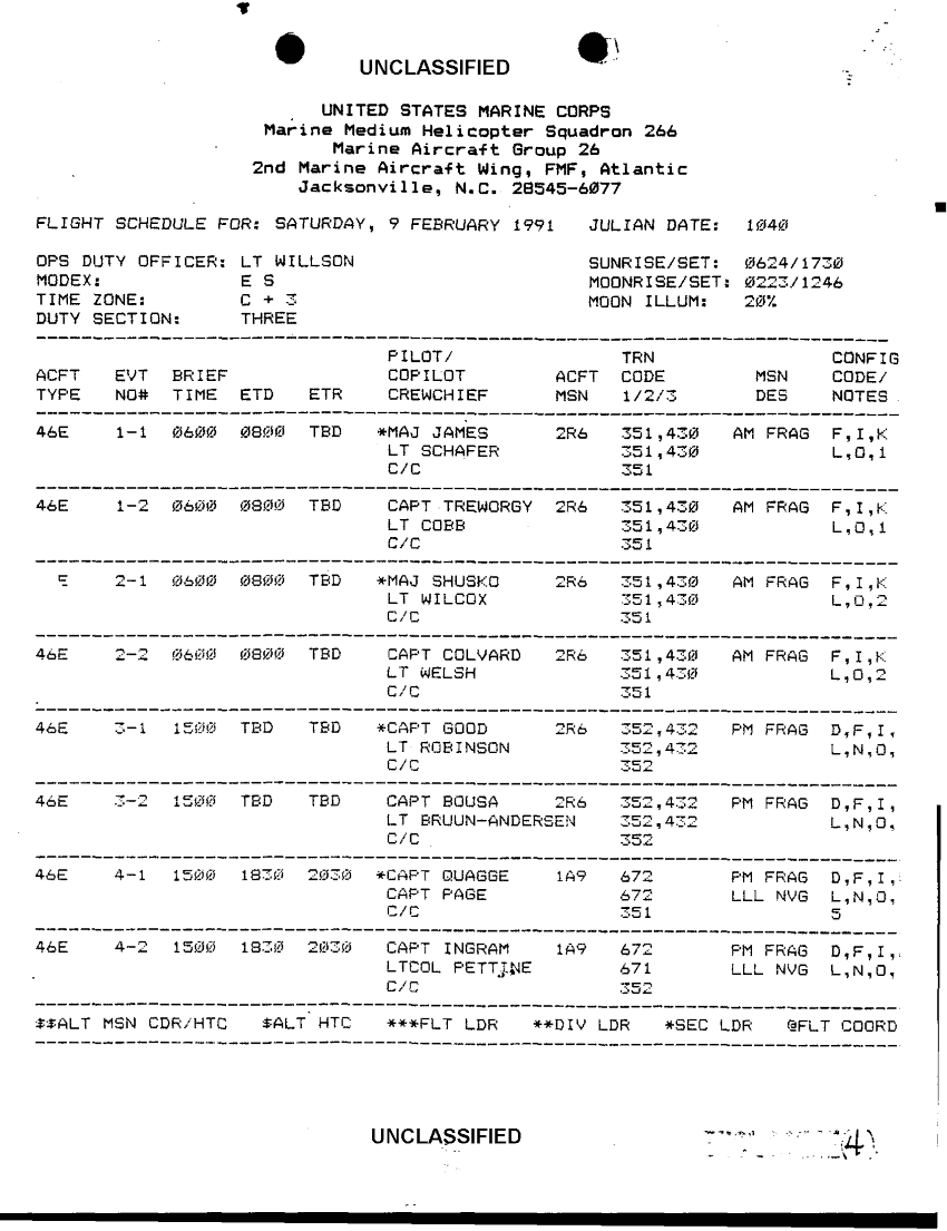 Document 2 f:/Week-38/BX600027/COMMAND CHRONOLOGY HMM 266 FEB 91 - JUN 91/flight schedule for saturday 9 feb 1991 julian d:10189614542220