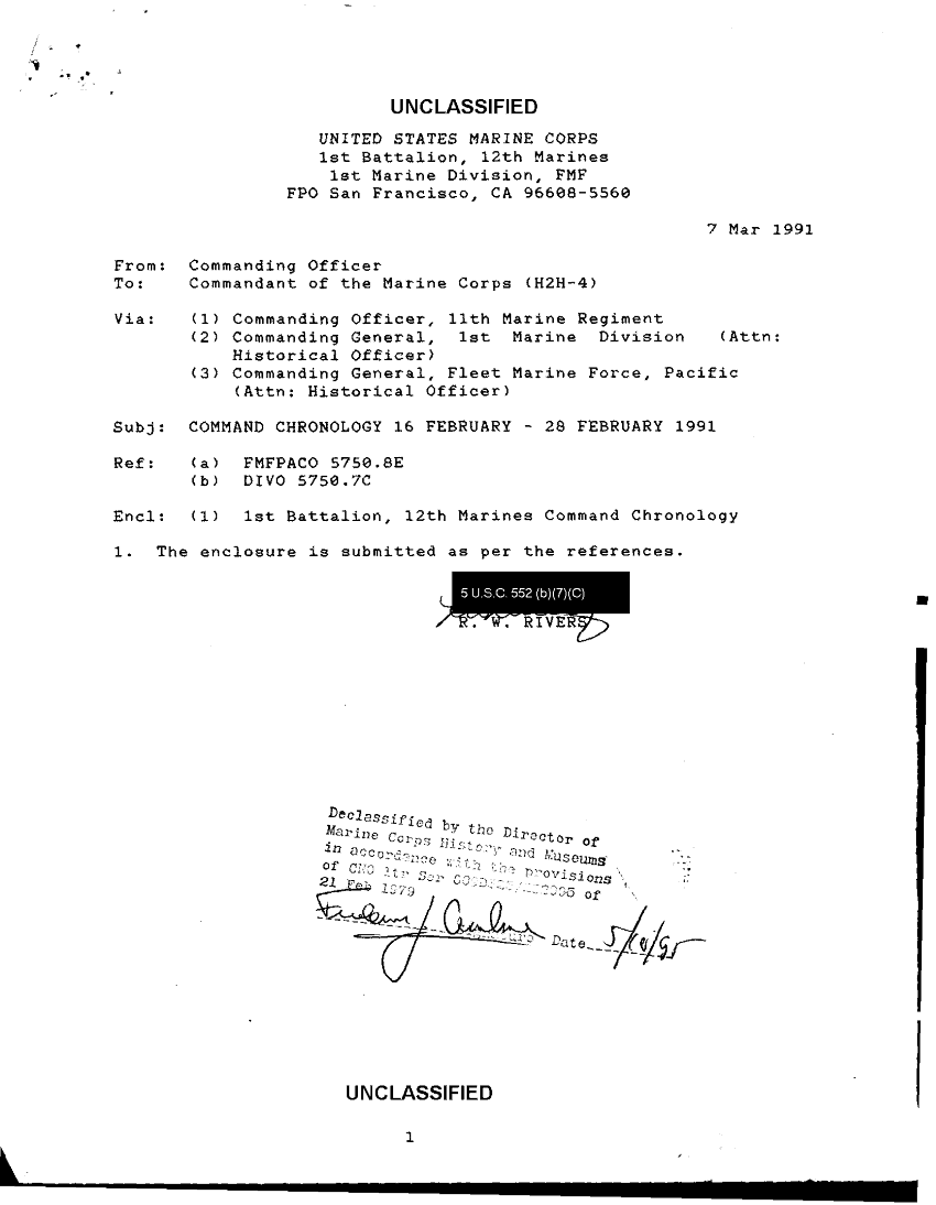 Document 11 f:/Week-38/BX600025/COMMAND CHRONOLOGY 1ST BATTALION 12TH MARINE REGIMENT JAN - FEB 1991/cmd chronology 16 28 feb 91 7 mar 91:10259613200511