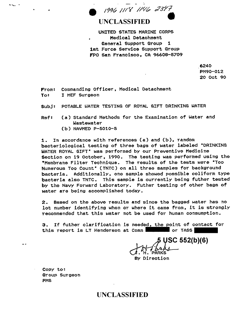 Document 1 f:/Week-44/BX600093/FOLDER NAVAL MESSAGE FILES AUG OCT 90 ARMY REFERRAL/potable water tstng of royal gift drkng water 2:01029709372016