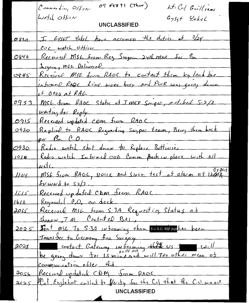 Document 103 f:/Week-35/BX600013/COMMAND CHRONOLOGY 3RD BATTALION 24TH MARINES JAN - MAR 1991 4 OF 4/handwritten log:0102970950272