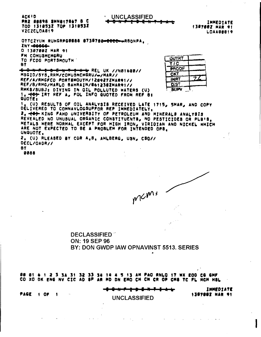 Document 1 f:/Week-36/BX300029/SITREPS AND OTHER MISC RPTS CNA 2139/diving in oil pulluted waters 13 mar 91:0925961702219