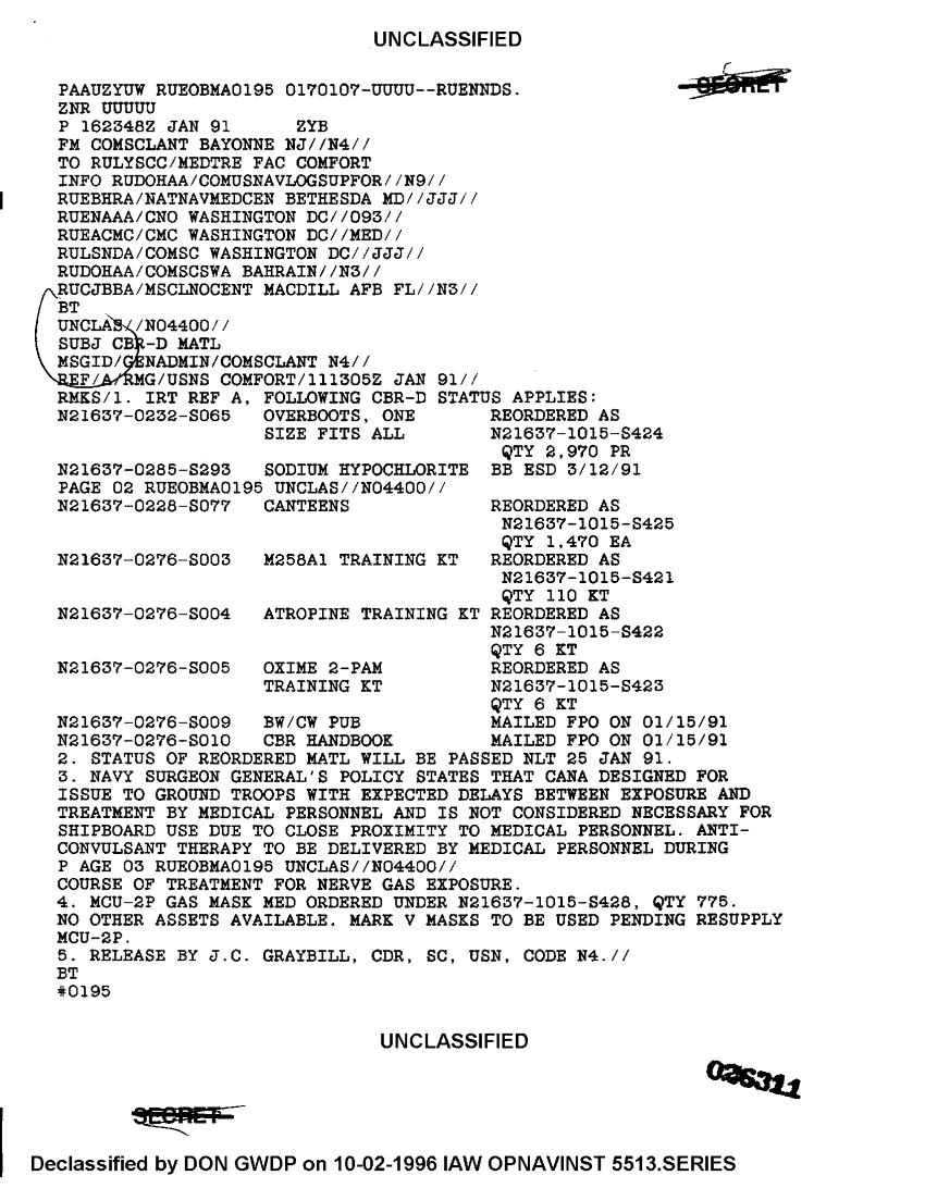 Document 1 f:/Week-36/BX300052/VARIOUS COMMANDS VARIOUS MESSAGES CNA 2908/general admin to medtre fac comfort 16 jan 91:10189614514617