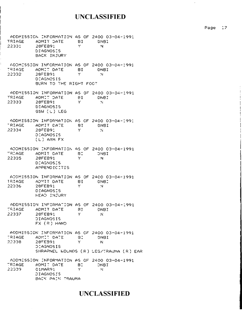 Document 34 f:/Week-42/BX300118/FOLDER 2 - PATIENTS TREATED - AL KHANJAR TRAUMA CENTER MAR 91/admission information as of 2400 03 04 1991:1112:1112961728162