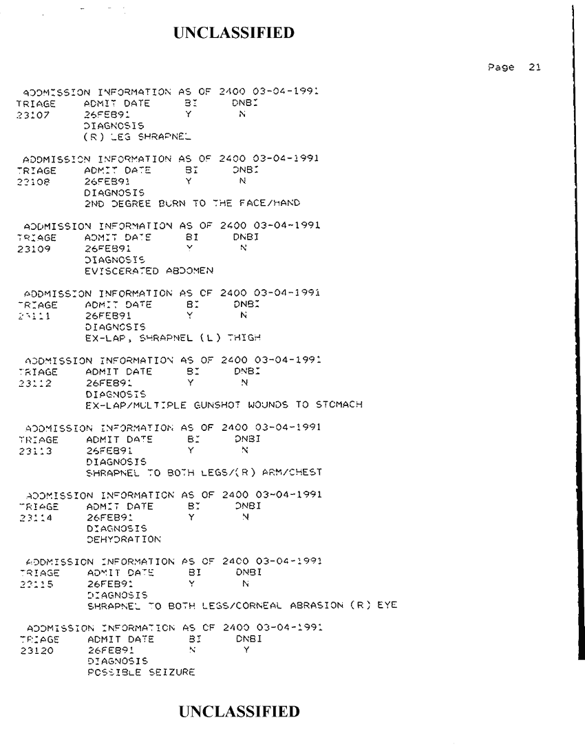 Document 34 f:/Week-42/BX300118/FOLDER 2 - PATIENTS TREATED - AL KHANJAR TRAUMA CENTER MAR 91/admission information as of 2400 03 04 1991:1112:1112961728162
