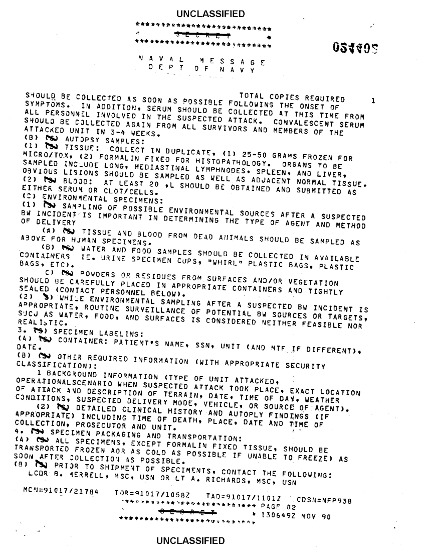 Document 3 f:/Week-41/BX300104/COMUSNAVLOGSUPFOR NAVY MEDICAL MESSAGE FILES 1990-1991 CNA 2910/collection and transportation of suspected bw sp:11129610111011