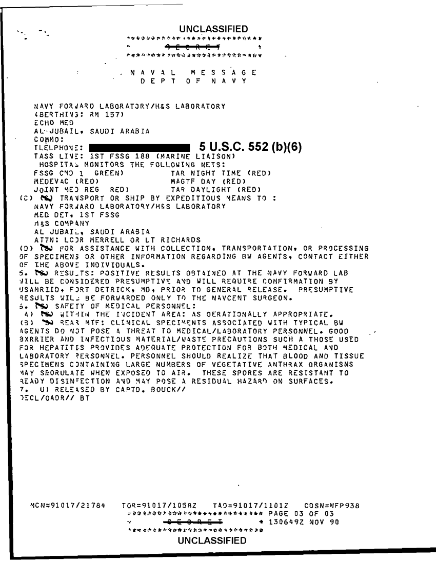Document 3 f:/Week-41/BX300104/COMUSNAVLOGSUPFOR NAVY MEDICAL MESSAGE FILES 1990-1991 CNA 2910/collection and transportation of suspected bw sp:11129610111011