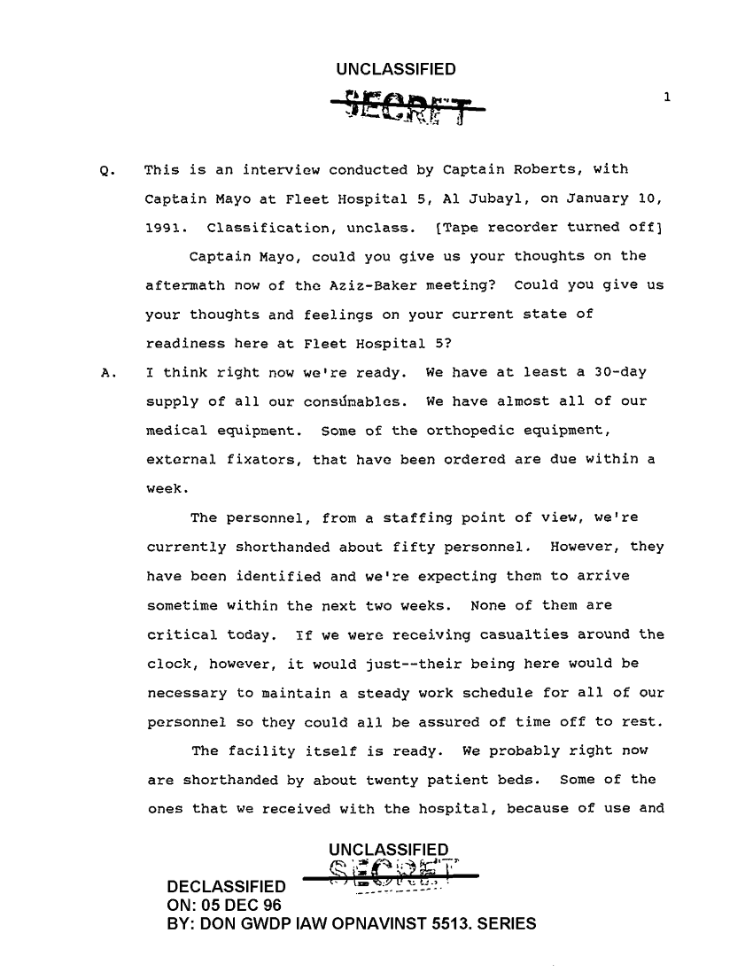 Document 5 f:/Week-46/BX300235/NAVCENT INTERVIEW ABSTRACT CAPT RICHARD A MAYO MC USN CO FLEET HOSP 5 10 JAN 91/interview with captain mayo mc usn 10 jan 1:1217960957535