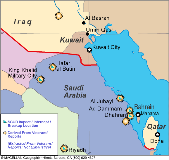 Figure 3. Map illustrating Scud impacts and intercepts derived from veterans' reports