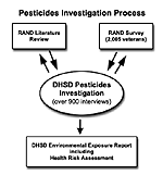 Figure 1 provides a simplified illustration of the pesticides investigation process conducted by the Deployment Health Support Directorate (DHSD). The DHSD investigation included a review of Gulf War records, documents, and related materials such as journal articles, and a review of DoD policies and guidelines involving the use and management of pesticides. Additionally, the investigation incorporated information from a RAND literature review of the health effects associated with pesticide exposure, and a RAND survey of 2,005 Gulf War veterans focusing on their use of and exposure to pesticides used during the Gulf War. DHSD interviewed over 900 other veterans to acquire information on pesticide application and management. Finally, DHSD synthesized all the information collected into the present Environmental Exposure Report, including a comprehensive health risk assessment (HRA). The HRA identifies and addresses in detail 15 pesticides of potential concern (POPCs), which posed the greatest potential for hazard to US servicemembers. Further details on the findings of the investigation are presented in Section IV.E.