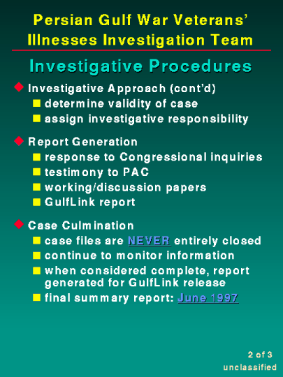 As you can see, the actual procedures required for each case file are unique to that case. Medical hypotheses, toxicological and conditional investigations require significant reviews of the medical literature. Incident or event investigations, such as Khamisiyah, require substantial resources dedicated to review intelligence and operational records, as well as identifying, locating and interviewing eyewitnesses. Team members have traveled to obtain information on a first hand basis; to Kuwait, to individual units and to technical experts in the fields being investigated. We consult the subject matter authorities, both within the Department of Defense and the civilian sector, to assist us with their expertise or to analyze information and samples.