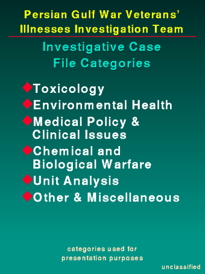 As stated in previous testimonies, the Team does not focus its efforts strictly on chemical warfare issues. Our case files do, however, appear to be skewed in the direction of chemical warfare issues. This is due to the sensitivity of this topic. Our charter is to investigate any plausible theory relating to Persian Gulf Veterans' Illnesses and to guarantee we do not overlook any possible cause. Many of our case files interrelate and some also provide supportive information to overall subject area reviews. In order to efficiently discuss our case files, they are arbitrarily separated into general file categories. The Team bases its investigations on the information identified to date, realizing that new data may be added. For your assistance, a list of acronyms used throughout our case file summary sheets has been provided. I will now address several of our representative files.