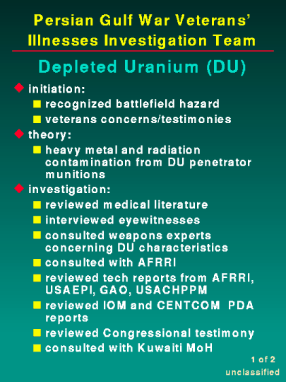 The net result of our investigative effort is that current literature and research do not indicate that DU is a likely cause of Persian Gulf illnesses. It is evident that many soldiers were around vehicles destroyed by DU munitions without taking proper protective measures. Additional research is definitely required. The Baltimore VA is currently following approximately thirty veterans with imbedded DU fragments and the Boston VA is following approximately twenty-five veterans of the U.S. Army 144th Maintenance Company. The latter unit was responsible for the recovery of DU contaminated vehicles and may have been exposed to breathable DU dust. To date, no evidence has been found to connect DU exposure to physiologic changes in these patients. The Team will continue our monitoring of the research efforts of these two study groups.