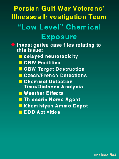 To shift gears slightly, the following slides address several case file updates requested by members of your staff. As mentioned earlier in our testimony, there are times when case files are grouped together, all relating to one issue, in this case "Low Level" Chemical Exposure. The case files shown build upon or are supportive of each other. For today's testimony, I will update the chemical and biological warfare facilities and target destruction, the Czech/French detections and the 37th Engineer Battalion: Khamisiyah Ammunition Depot case files.