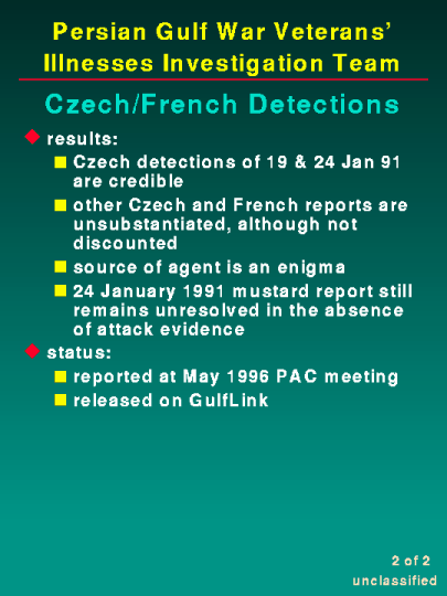As stated in prior testimony, based upon the information available at this time, the available evidence indicates that the Czech detections of 19 and 24 January 1991 are credible. The other Czech and French reports are unsubstantiated, although they cannot be discounted. The reported mustard agent detection of 24 January 1991 still remains unresolved in the absence of any evidence of an attack. Our report on the Czech/French detections is complete and will be released on GulfLink soon.
