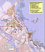 Although there were a number of facilities in the quadrant to the southeast of Camp 13 that could have produced the cloud, it could have come from other locations and been carried on the wind to the location where it was first sighted (Figure 11). Except for a housing area and a few isolated buildings and water towers, the southwest quadrant was virtually empty and therefore an unlikely origin of the cloud. The northwest quadrant contained cement and steel fabrication plants, but such facilities generally do not emit gases. The northeast quadrant, however, contained more gas-producing facilities than any quadrantthree fertilizer plants, three methanol plants, and four petrochemical plants. Two of the three fertilizer plants were within 1,000 meters from Camp 13s northeastern boundary. One plant was as close as 500 meters from the camp.