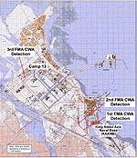 Five minutes after what seemed to be the end of the loud noise event, the UKs Force Maintenance Area (FMA) NBC cell notified the RAOC of the first of three chemical warfare agent detections by British forces personnel. The location (Figure 8) of the first detection, recorded at 4:03 AM, was at grid coordinates [Universal Transverse Mercator (UTM) 100,000 meter square grid identification UK] 652832 (latitude 26�57'51" north, longitude 049�38'31" east)west of King Abdul Aziz Naval Base adjacent to a major eight-lane southeast-northwest highway and not near one of the industrial complexes or a built-up area of the city. The RAOC responded by notifying higher headquarters and other units in the Al Jubayl area of the detection. The FMA informed the RAOC at 4:19 AM that it confirmed the detection as blister agent. At 4:35 AM, the FMA reported a second blister agent detection at grid coordinates [UTM grid zone UK] 644845 (latitude 26�58'33" north, longitude 049�38' 01" east), a different location from the first positive detection, and a second positive reading for blister agent at the site of the first detection. The second detection occurred about a mile north from the first detection, along a north-south highway, near the intersection with the highway where the FMA unit made its first detection. While the first detection occurred along the side of the northwest-southeast highway, the second detection occurred about one-half mile from the north-south highway in an open storage area. At 5:15 AM, the FMA reported a third positive CWA detection at grid coordinates [UTM grid zone UK] 545935 (latitude 27�3'22" north, longitude 049�31'58" east)located near a cement factory approximately 14 miles northwest of the first detection, 13 miles northwest of the second detection, and one mile west of Camp 13.