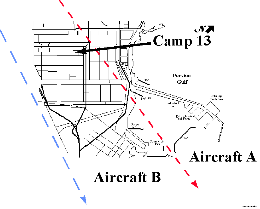 Based upon the information that has been reviewed to date, investigators have determined the loud noise was a sonic boom caused by coalition aircraft. Records reviewed to date show that no SCUDs were launched towards the vicinity of Al Jubayl on January 19, 1991.[37] However, as this was the third day of the air war, the skies were full of aircraft either flying to their assigned targets or on their way back to their home station. Many aircraft had to be refueled while airborne in order to complete their mission. To maintain a steady flow of aircraft and fuel, as well as prevent a mid-air disaster, refueling aircraft (both tankers and the aircraft to be refueled) were required to fly assigned routes or orbits. The sheer size of the air campaign required many refueling routes over Saudi Arabia, including over the port city of Al Jubayl.