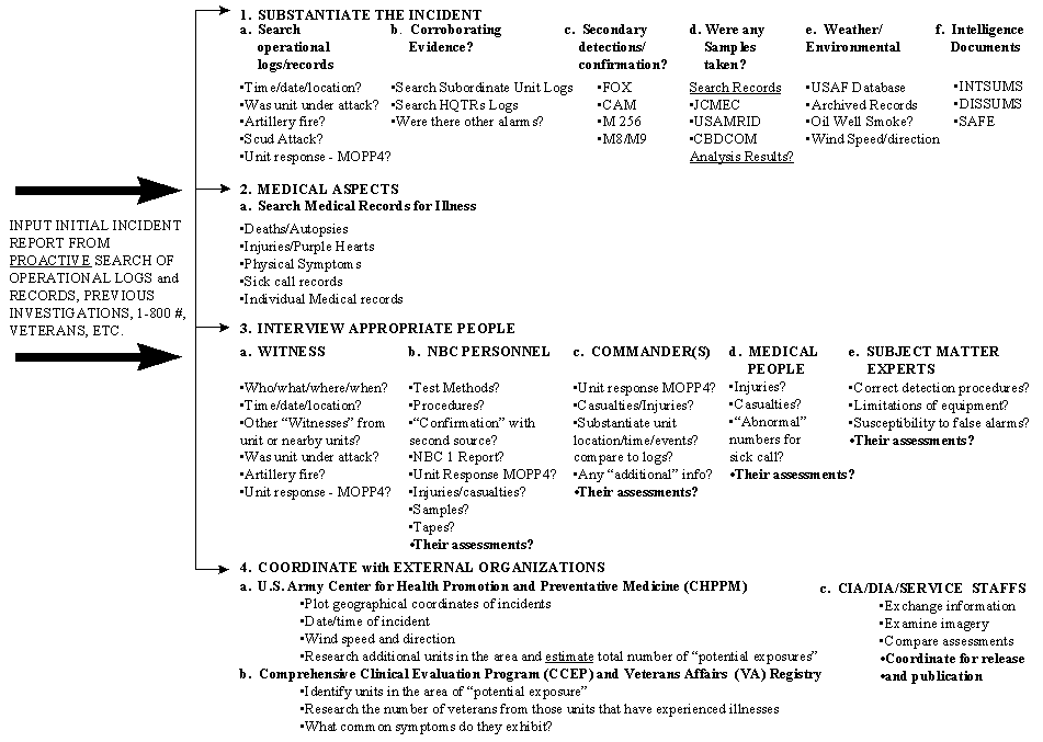 The investigator searches the medical records to determine if personnel were injured as a result of the incident. Deaths, injuries, sicknesses, etc. near the time and location of an incident may be telling. Medical experts should provide information about alleged chemical casualties.