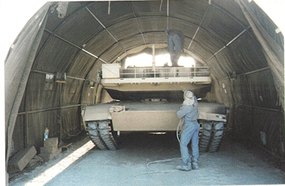Figure 5. A member of the 325th Maintenance Company spray paints desert tan CARC onto a tank